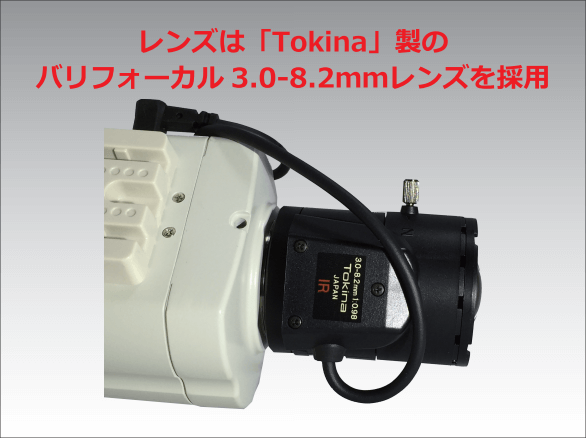 | レンズ仕様 | TOKINA製バリフォーカル3~8.2mm(画角79°~36°) オートアイリスIR | バリフォーカル2.5~6.0mm(画角108°~47°) オートアイリスIR |