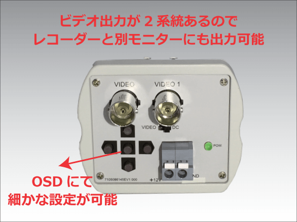 低照度の環境で、電子的に感度をUPさせるデイ&ナイト機能付。日中はカラー映像で見やすく、低照度では白黒モードに自動切換えするので、24時間の監視に最適です。