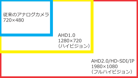 下図の画像サイズ比較表をご覧下さい。従来のアナログカメラと比べて画素数が4倍以上になり、IPカメラのような画像の遅延もありません。