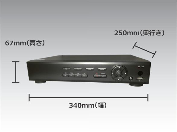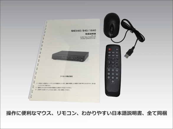 本体サイズはW340×H63×D262と他機種と比べて一回り小さい設計なので、場所を選ばず設置可能。本体操作に加えて、付属のリモコン、マウスにて簡単操作ができます。万が一の際は警察関係へのデータ受け渡しにUSBメモリで対応できます。